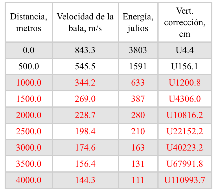 No hace mucho leí que el alcance maximo del 30/06 con bala de 150 graims , si no recuerdo mal , tirando en un ángulo de 43 grados era de 4.300 metros , y la bala caía al suelo con una energía de unos 325 julios , que es muchísimo ....