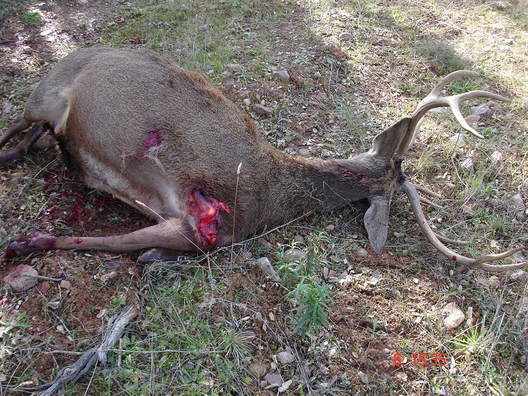 A pesar de usar la hornady 165 y no ser del 3006, le he dejado seco. Tiene dos tiros porque es norma de la casa: Que un animal en el suelo si se intenta levantar, se le alivie el sufrimiento.