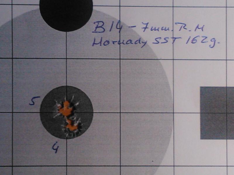 En cuanto a la precisión, para muestra un botón. Estas dos fotos son de las agrupaciones conseguidas con un B14 en 7mmRM, visor a 16 aumentos a 100 metros. Los dos primeros impactos correspondientes a la primera diana con munición Hornady SST 162g, y el impacto de la segunda con Hornady SST 154g. Disparé los tres disparos seguidos dejando enfriar el cañón y utilicé dos dianas distintas por emplear municiones de igual punta pero distinto peso. De haber disparado los tres en la misma diana hubiera metido los tres impactos en el círculo de 2 cm de diámetro. Curiosamente con la munición de menos peso no ha habido una elevación del punto de impacto como cabría suponer.