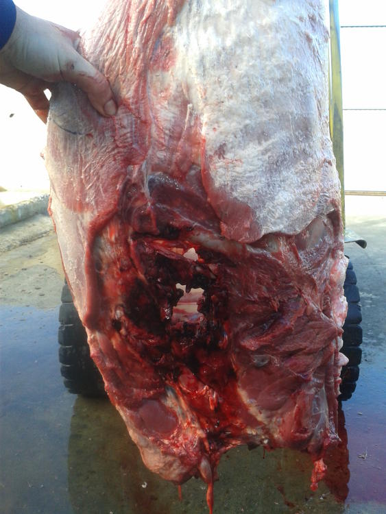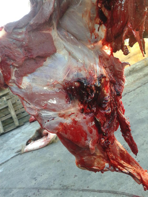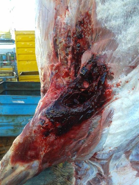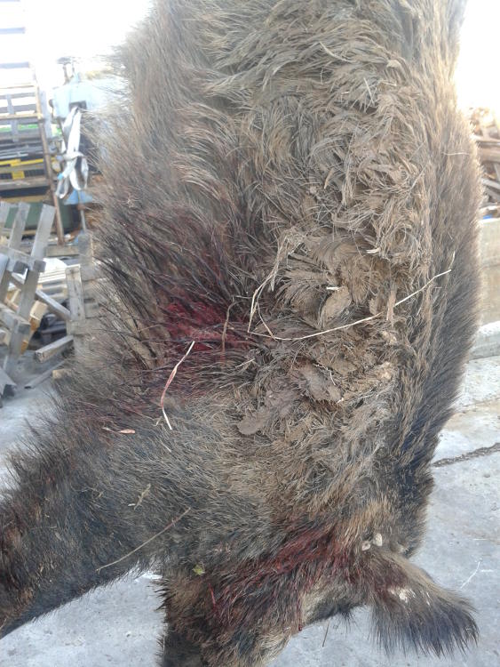 Con un 308win, la punta por las fechas es una acubond de 165gn . Unas fotos del lado contrario al tiro, el proyectil le pego de lleno en el hueso haciendolo polvo. La sangre "en la oreja" suele ser habitual , les meto el cuchillo en el cuello en vez de en las costillas :wink: .