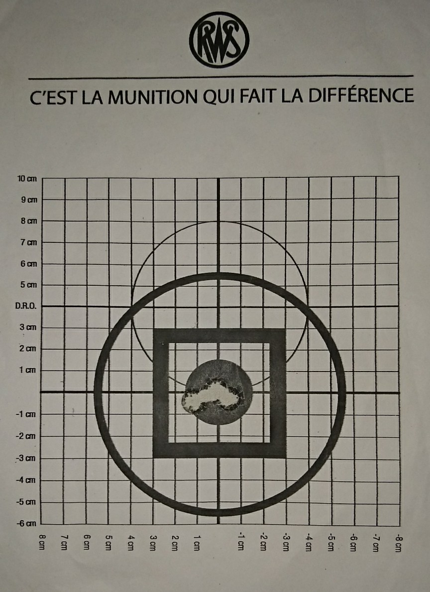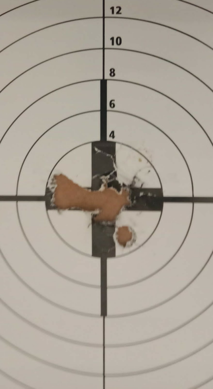 Dos tiros arriba a la derecha, se midió, se tocó la torreta y un tercero un pelín bajo, clic correspondiente y tiro al centro.