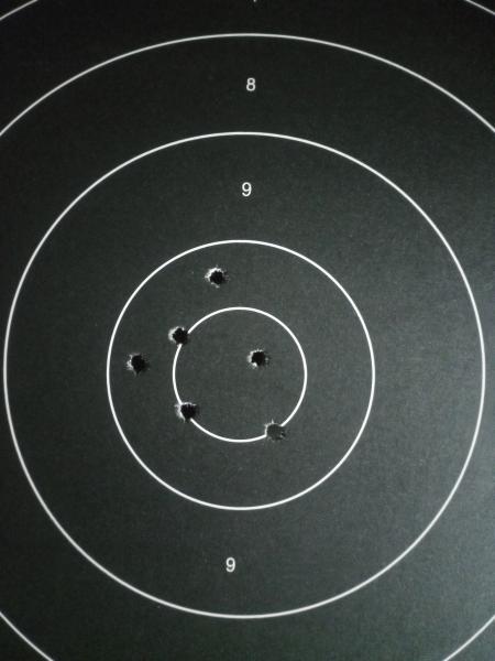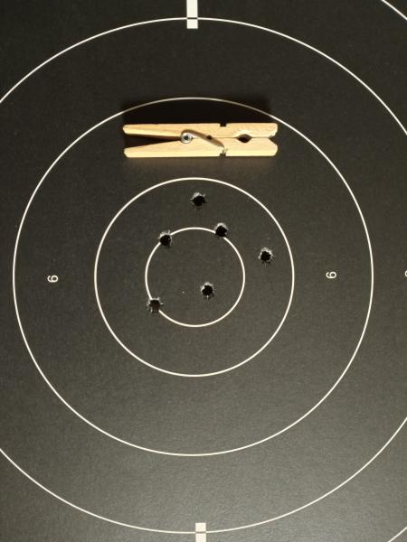 La de los seis impactos es a 200 m y se caracteriza porque los tres tiros más bajos han sido con la carga descrita y los tres altos y un poco a la izquierda es la misma carga pero con pistón Fiocchi. Me parece que a 200 ha jugado un poco el paralaje.