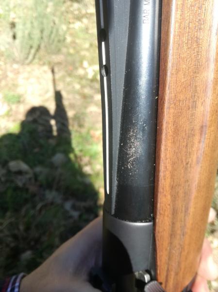 Hasta hace poco, las únicas marcas que tenia en el cañón eran unas pequeñitas de rozar la anilla de la correa, pero desde hace unas semanas empecé a notar en unas zonas, que el pavon se ponía raro ( como cuando pintas algo y te quedan hilos del polvo pegados).