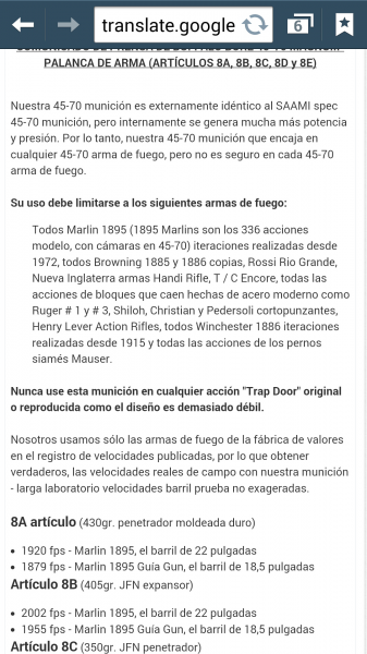 Gracias por vuestros comentarios. El otro día fui a la armería donde quería comprar el Winchester por que es distribuidor oficial y, vimos el catálogo 2015 de la marca y sale el modelo94 short (corto) con calibre 30-30 -creo recordar- y el de cañón de 61cm también con este calibre. Seguidamente vi el modelo 94 takedown (desmontable) con la misma lorgura de cañón (61cm) pero con calibre solo .450 Marlin. Tengo claro que quiero palanca todo y que, últimamente me debatía por un Winchester o un Henry. Entonces como oí que podía haber problemas con el tema de la munición pregunté (no me acuerdo la página) telefónicamente al distribuidor de Hornady en España para además, poder tener munición tanto con punta roma como con las nuevas Leverevolution de Hornady (punta de plástico para ganar en distancia, entre otras...). La cuestión es que me dijeron que el calibre ya es legal en España y que no hay problema para conseguir tanto munición completa como puntas, vainas y la pólvora para recarga. En ese momento el suspiro fue de ilusión y alegría.