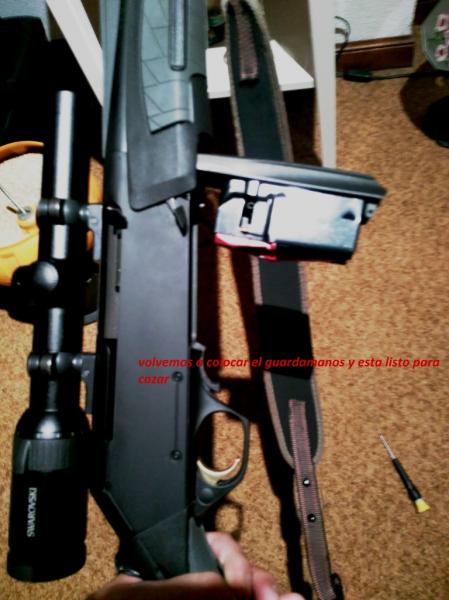 bueno pues hacerlo al reves no es tan facil he compraqdo la tapa del cargador estraible para ponersela al bar 2 y es mas grande pega en la madera por lo que con la dremel he tenido que rebajar la tapa hasta que no pega y una pestaña que llega donde engancha el boton para estraer el cargador tambien ahi que limarlo aparte de limar donde va el pasador pero me da que ahi no avia que limarlo pero bueno al final lo he puesto y bueno no queda todo lo bien que a mi me gustaria pero a falta de probarlo en el campo no va nada mal he probado el cerrojo y las balas entran en la recamara perfectamente el cerrojo no se engancha en el cargador