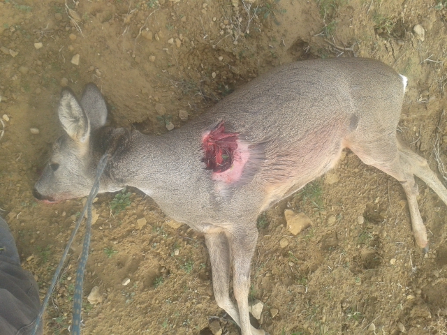 Muchas veces he visto casos como el tuyo, en que un cazador ha de tirar con lo que tiene, en incluso a mí me ha pasado, y curiosamente se ven los agujeros más limpitos, de cavitación tanto temporal como permanente sólo ligeramente ahusada, y poca necrosis, cuando se ha usado una bala pesada para el calibre y de velocidad moderada. Hablo de balas que, al estar diseñadas para resistir un impacto a velocidad alta o medio-alta contra un animal corpulento y duro, apenas expanden porque el corzo no es rival para ellas y por tanto lo traspasan limpiamente.