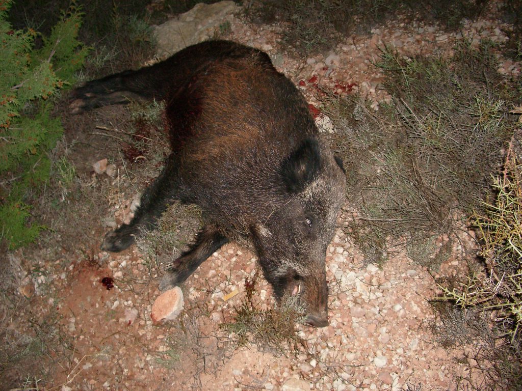 Situación, cacería en espera, distancia de tiro 120 metros, peso del jabalí 110 Kgr calibre utilizado 7x64 bala la antigua TIG de 177 Grains.