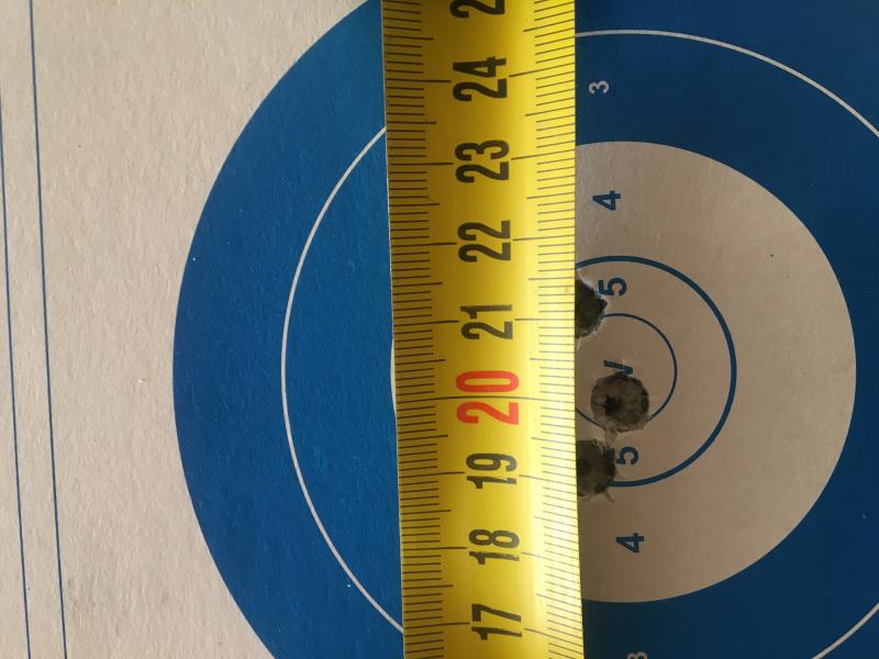 Desmonto la tpa torreta y subo 3 clicks de altura, me dispongo a disparar ahora sobre otra zona de la diana para evitar liarme con los tiros. Previo pasado de baqueta nuevamente y dejando enfriar hago dos tiros nuevos, esta vez perfectamente centrados en altura y deriva y separados esta vez algo más pero ambos en menos de 1,5 cm.