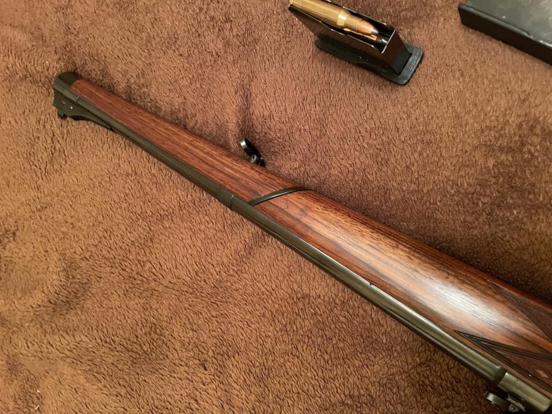Se ha restaurado tornillo a tornillo, pulido y pavonado de toda la piezeria, se ha respetado el pavon original que están muy bien de caño y acción, maderas al aceite, afinado del pelo disparador (Segundo gatillo) ,recentrado percutor,cambio uña y muelle extractor, pulido del cerrojo, restaurar el cargador original y buscar uno nuevo, ha sido todo un reto. etc.en fin !. Un capricho que me ha salido caro al final, pero que deja un arma dificil de encontrar hoy en día. Se le ha montado un visor Leupold 4-12x40 con torreta y reticula tmr. Visor de 360 gramos de peso y muy compacto, que le va perfecto debido al pequeño tamaño del rifle. Ahora con sako varmint de 40 grains a 1.060