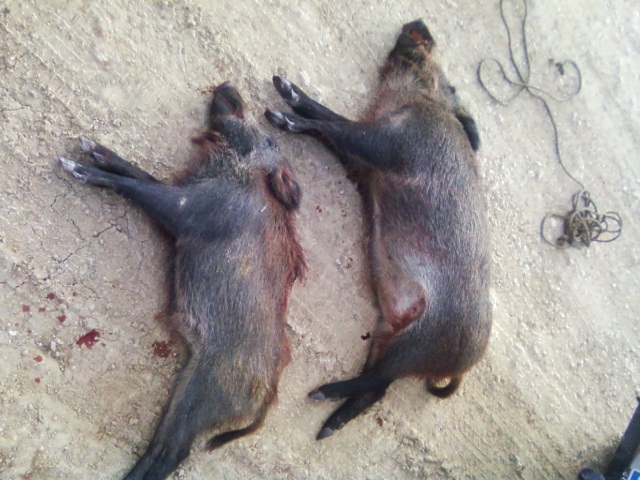 la verdad es que fue un lance bonito,ya que tomaron sus precauciones para entrar dada la presion cinegetica que soporta la especie en esta zona.el mas grande tenia 2 impactos,un roce en la cabeza y el segundo que entro por la grupa,el otro claro esta donde le dio(de noche y corriendo no pude hacer mas)y fue muy efectivo.lo malo...no tener un coche para cargarlos y tener que pedir ayuda por la mañana...