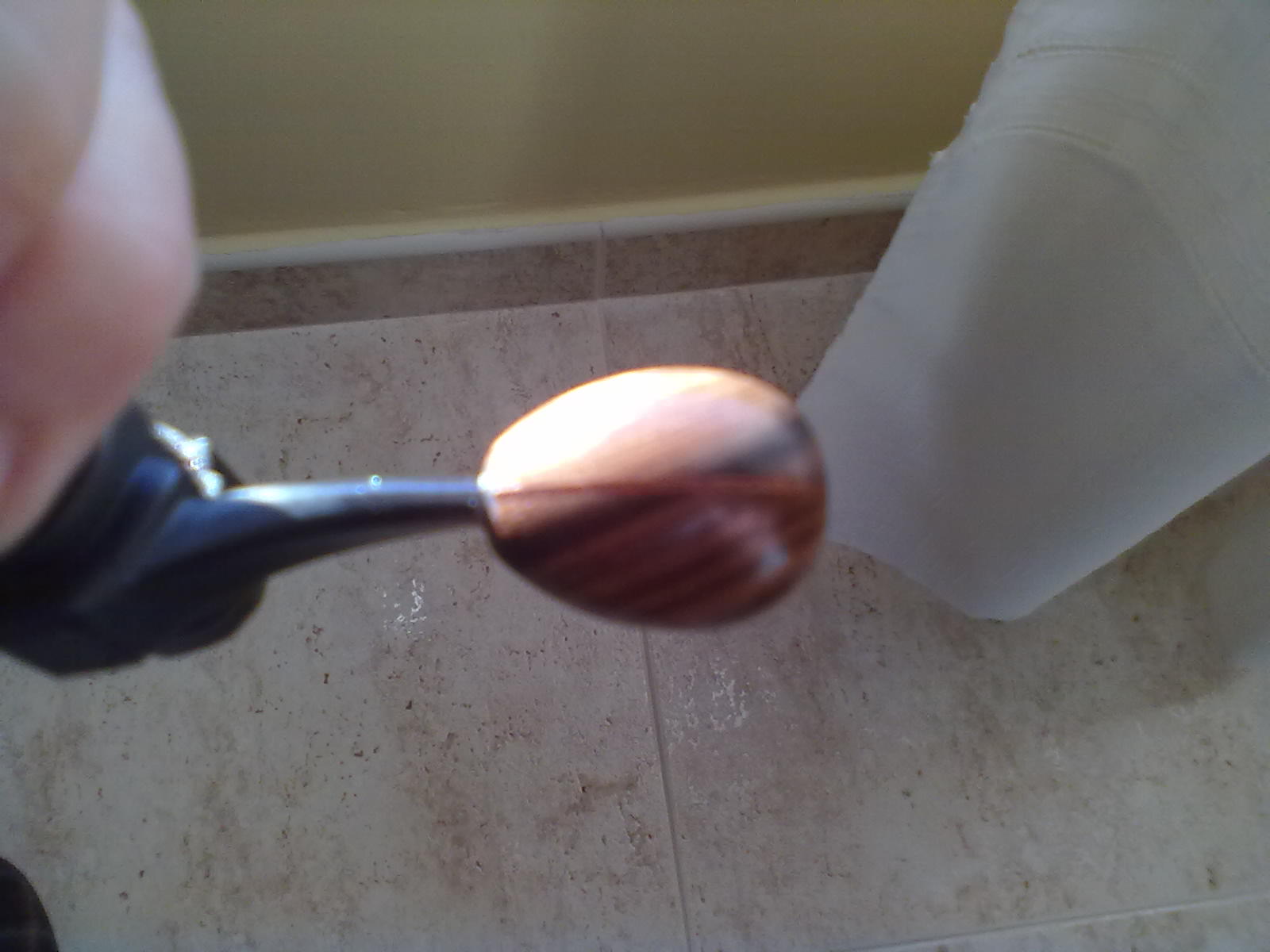 Solución a un problema parecido en un X-BOLT, sin cortar, ni soldar ni modificar en nada el material original del cerrojo. En mi caso la única necesidad era agrandar un poco la bola. Las fotos no son muy buenas pero se puede apreciar el resultado, es una bola de nogal cortada en dos, ahuecada y vuelta a pegar alrededor de la bola original con pegamento epoxi , la junta de unión que se ve, son dos laminas de Sapelli de rechapar que fueron pegadas a una de las mitades antes de vaciarla.