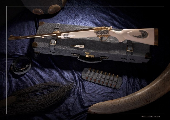 hola,aqui os pongo unas fotos de un rifle de la casa blaser,de super lujo.por supuesto no es mio,ya lo quisiera.la culata es totalmente de marfil,con motivos de elefantes en scrimshaw(creo que la tecnica de dibujo se llama asi)incrustaciones de oro,y burilados,viene con una funda de piel de elefante,al igual que la correa porta fusil.obviamente no es un rifle para llevarselo a cazar.lo vi en un articulo de la revista armas internacional,luego saque estas imagenes de internet.creo que vale la pena contemplarlo.lo unico que no me ha gustado es la trompa en forma de pichilla que tiene en el lateral.lo que si que es, cuanto menos curioso.