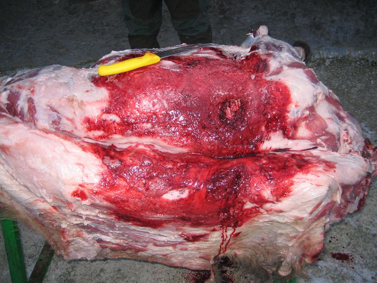 Por el sitio donde tiene el tiro, es mal ejemplo para valorar un tipo de munición. La bala le debio de destrozar la columna vertebral, pero lo mismo hubiese hecho cualquier tipo de bala que hubieses tirado, es un punto del animal que si le tocas ahí, puede que no muera de momento, pero desde luego no da un paso mas.