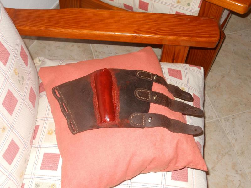 Como no dispongo ahora mismo de cuero de calidad, hice un "borrador" en serraje engrasado, y si me funciona bien cuando la pruebe tirando (aun no lo he hecho) traspasaré el "cojin" al nuevo armazon de cuero de calidad. la parte que apoya en la cara, o cojin, como yo le llamo, esta hecho de una pieza de goma forrada de un trozo de material parecido al neopreno (para que este blando) y finalmente forrado de baquetilla fina. El color de la baquetilla era de color rosa, de ahí las manchas del tinte que tiene.