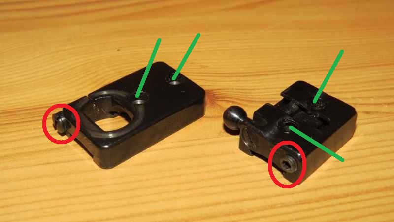 Las lineas verdes corresponden a tornillos prisioneros para hacer presion sobre la carabina y que no se muevan las monturas. Me imagino yo, vamos.... es la logica que le veo.