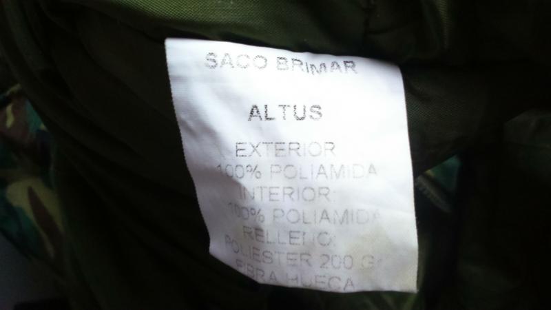 Es marca Altus, de color mimetizado. En la etiqueta pone interior y exterior 100% poliamida, relleno poliéster 200gr fibra hueca. También pone "saco brimar". No pone nada más. Con cremallera lateral, y saco de compresión.