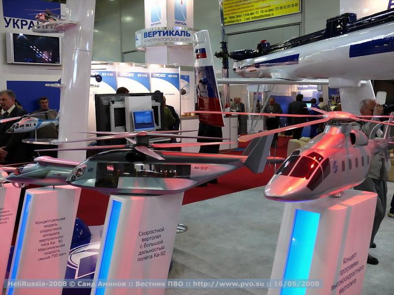 Ka-92 no es simplemente una maqueta, es un desarrollo en construccion. En cuanto al Ka-90, supongo que este es poco mas que un diseño conceptual, de todas formas con la foto se puede sacar una idea equivocada de lo que es, en realidad se trata de un aparato con rotor de dos palas cuales se doblan en linea al alcanzar velocidades elevadas, lo que lo convierte en practicamente un helicoptero-cohete, de la propulsion se encargaria un turbofan. En teoria eso no simplemente podria volar, sino hacerlo a unas velocidades incluso supersonicas, pero sin encargos de desarrollo por parte de agencias gubernamentales o del ejercito, veo muy dificil que llegue a fabricarse en los proximos años.