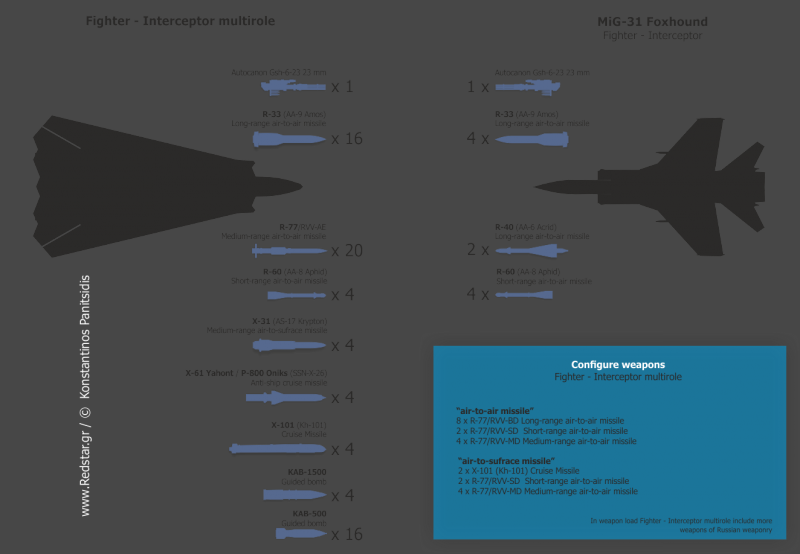 Porta el misil K-37M con 300 km de alcance, y se dice que han trabajado en este para hacer uno con mas alcance entre otras mejoras.