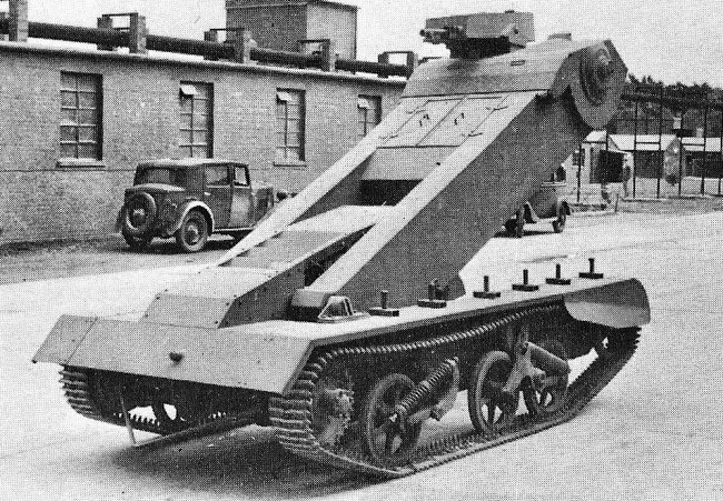 Es un prototipo de Bren Carrier llamado Praying Mantis (Mantis religiosa) en la que el casco era sustituido por una estructura elevable en forma de caja con el espacio suficiente para el conductor y el artillero tumbados y dotado de una torre con dos ametralladoras Bren en la parte superior. Se supone que la idea era que la Mantis llegara hasta un muro, elevara la estructura y pudiera hacer fuego por encima con seguridad. No prosperó, como es de suponer...