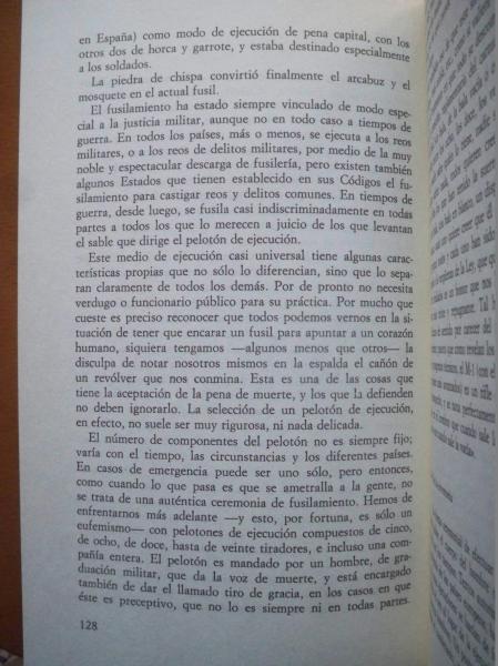 Aunque era algo que yo ya suponía, el libro incide en lo hipócrita que es lo de la "bala falsa" o de fogueo pues es una mera forma de acallar conciencias y que así cada uno es libre de pensar que le tocó a él la de fogueo (Tan solo una por pelotón, las demás reales). Y es que cualquiera que haya disparado un cartucho real y uno de fogueo sabe que es perfectamente distinguible uno de otro, tanto por su retroceso como por el sonido y si es un arma de cerrojo porque al extraer la vaina se ve y si es un arma semiautomática porque sencillamente no mecaniza. Pero así cada uno siempre puede decir que fue la bala de otro la que mató al condenado y nadie se lo puede rebatir.