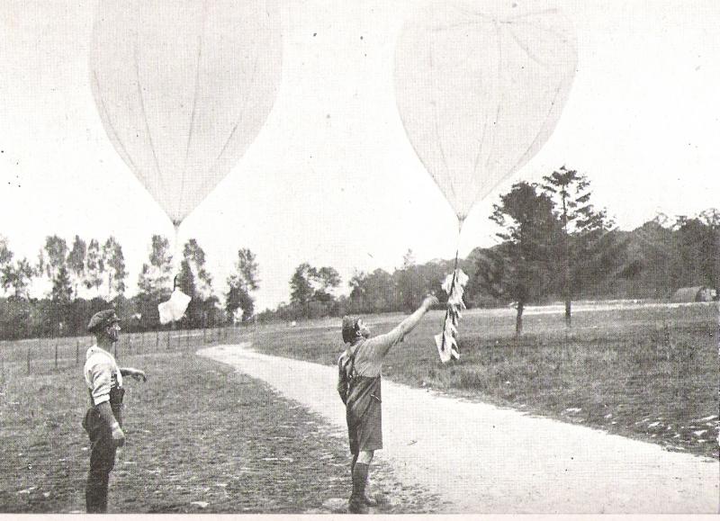 En este caso son ingleses en la IGM, se lanzan folletos y octavillas de propaganda por medio de globos de hidrógeno, de los que cuelga un tubo de hierro perforado a intervalos regulares, al que se le acopla una mecha de mechero y una cinta que ata manojos de folletos espaciados...según arde la mecha, va quemando la cinta y se sueltan las octavillas...según a donde van dirigidas, el viento, el hinchado del globo...la longitud de la mecha y de la cinta se graduaba para que se desparramaran donde interesaba