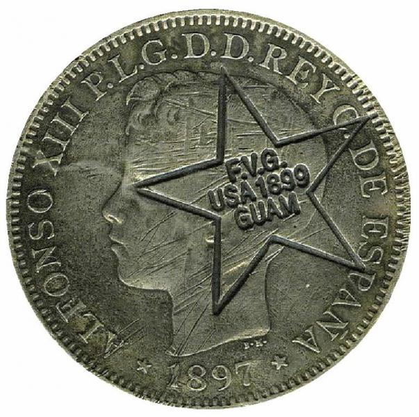 al depender Guam de la Capitanía de Filipinas, circulaba el peso, este de la imagen esta resellado por los EE.UU. al año de su ocupación.