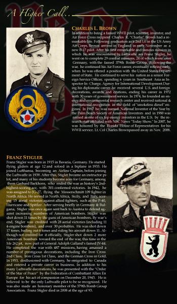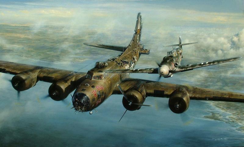 De repente un avión alemán, un Bf109 pilotado por el as de la Luftwaffe Franz Stiegler, se coloca a su cola.... dispuesto a abatirlo... El piloto alemán observa que no tiene defensa trasera, se coloca a la derecha del percatandose del estado de la tripulación. Llega a la altura de la cabina de Charles Brown, el cual muerto de miedo, se da por perdido, cierra los ojos y niega con la cabeza: "están perdidos!"