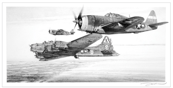 Más tarde, ya sobre el mar. Su escolta alemana lo deja ir y esta es sustituida por dos P47, que también habian participado en el raid... Que lo escoltan hasta el campo de aviación de Sheeting.