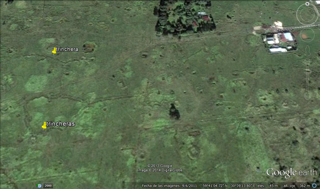 Buscando en Google Earth he encontrado trincheras de posiciones españolas, creo que los redondeles que se aprecian alrededor de las trincheras son crateres de las bombas. ¿Que opinais?.