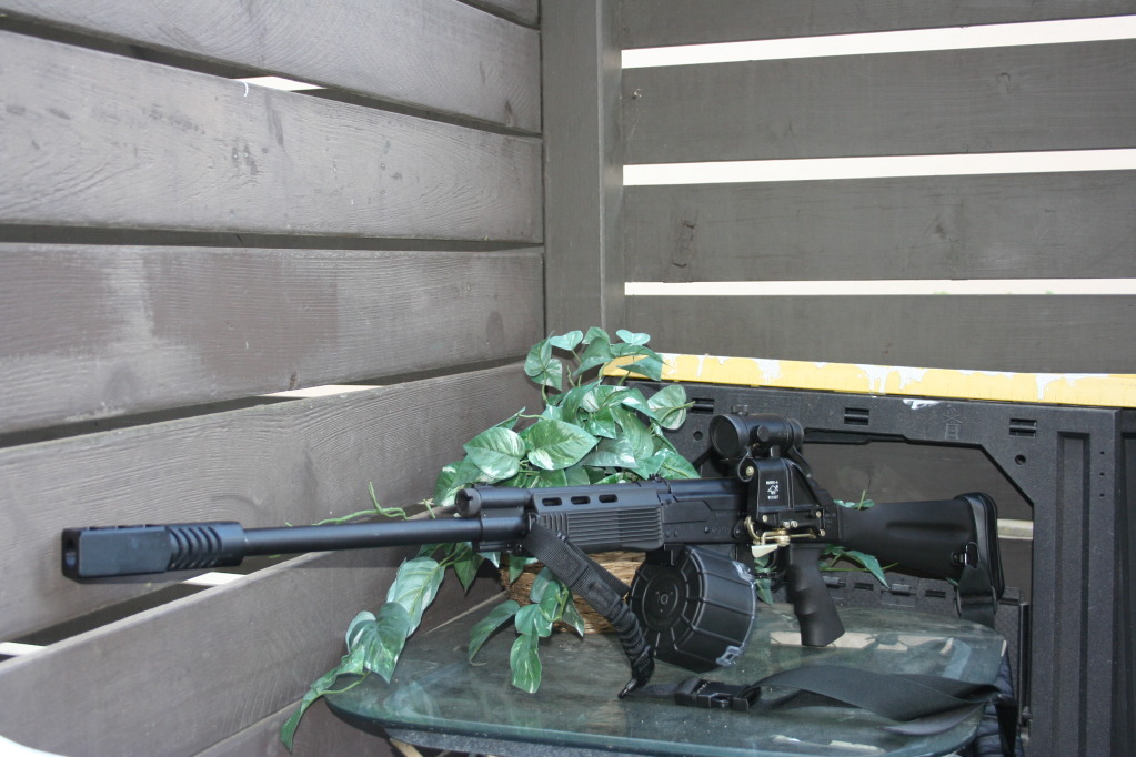 ¿Una Saiga 12-K con freno de boca?. !!No lo necesita!!. Qué pena que en España no nos dejen utilizar esos cargadores cilíndricos con capacidad para 25 cartuchos (no para la caza sino para otras modalidades de tiro).