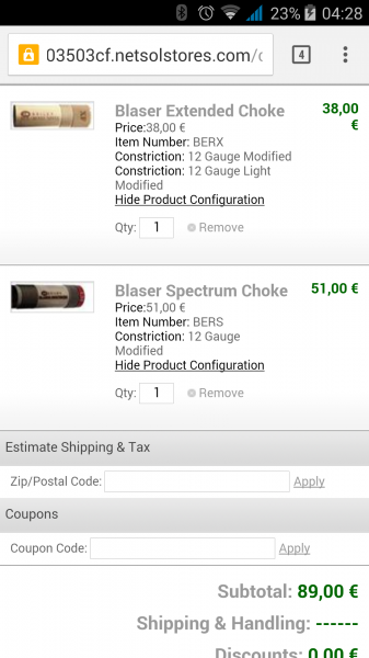 Ya te dije que tras mucho buscar es donde mas baratos los he encontrado,tienen muy bueno precios,lo peor es la espera si no quieres pagar lo que cuesta otro choke,en gastos de envio para tenerlos en 7 días,yo le aconseje esta web al que le vendi la Blaser f3,y no se creía los precios que tenían.