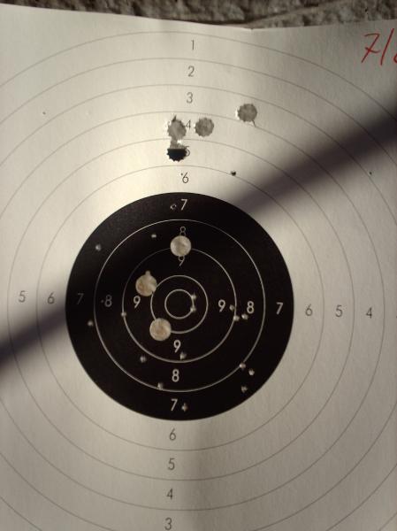 Para muestra cuelgo las dianas de pruebas hechas con sabot y sin sabot (con mosberg 500 con cañon rayado, apoyado en mesa, sentado en silla y saquete de tiro apoyado en el cañon), donde se aprecia que las sabot son menos precisas (mas dispersión) que las sin sabot (menos dispersión).
