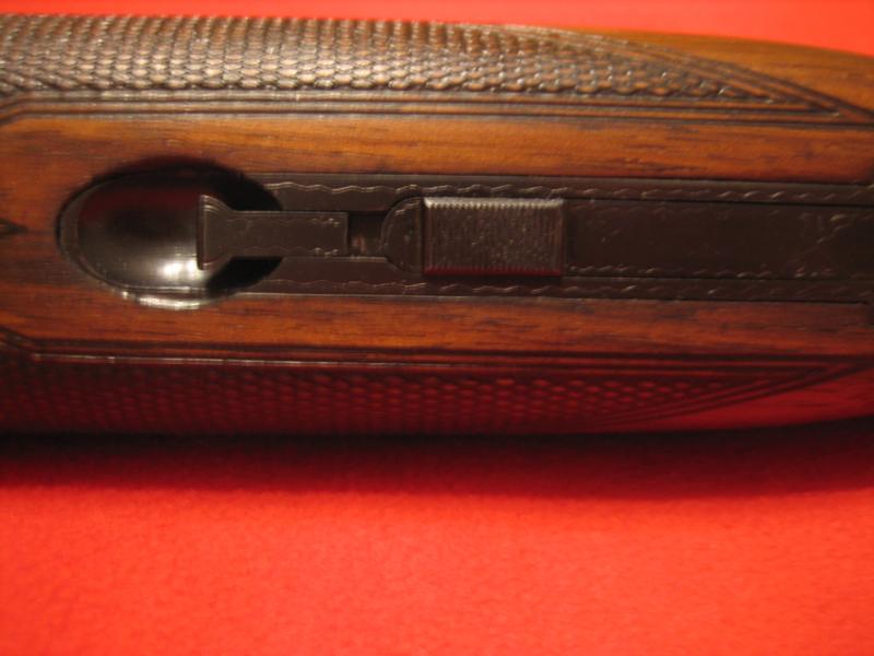 Sin embargo, posiblemente de las jornadas de caza, la báscula estaba algo sobada sobre todo por la zona inferior, así como la rabera del guardamontes y la llave de apertura del guardamanos. Y luego, el sistema típico de la B25 de guardamanos fijo al cañón, hace que de montar y desmontar la escopeta se vaya gastando la parte del cañón inferior en una franja de un centímetro de anchura, que es lo que corre el guardamanos hacia delante y hacia atrás.