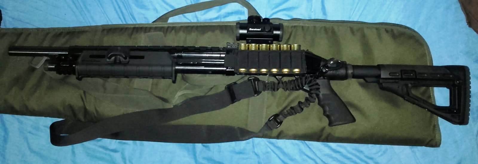 La de en medio, es una Stinger Tactical Defender, con cañón de 47 cm. y capacidad de carga de 6+1. Le he colocado una culata rígida con pistolet, todo ello de fibra y original de la propia marca Stinger; así como un raíl táctico Picatinny, además de una correa BlackHawk origina USA, de dos puntos de anclaje.