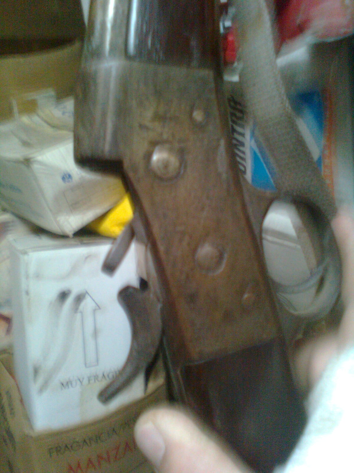 B.noches, no ,no lo he encontrado tirado.Su propietario, que lo tiene, sr ya con sus años me comentó que fu´e de su abuelo y que de aquella le hizo la culata.Me llama la atención que el anima del cañon es lisa, no tiene estrias.El cerrojo cirra el cañon por detrás como si fuera una pieza de artilleria y el marillo golpea sobre ella golpeando el "perillo".Es bastante curiosa, aparte de no tener mira trasera.Haber si puedo poner alguna foto mas.