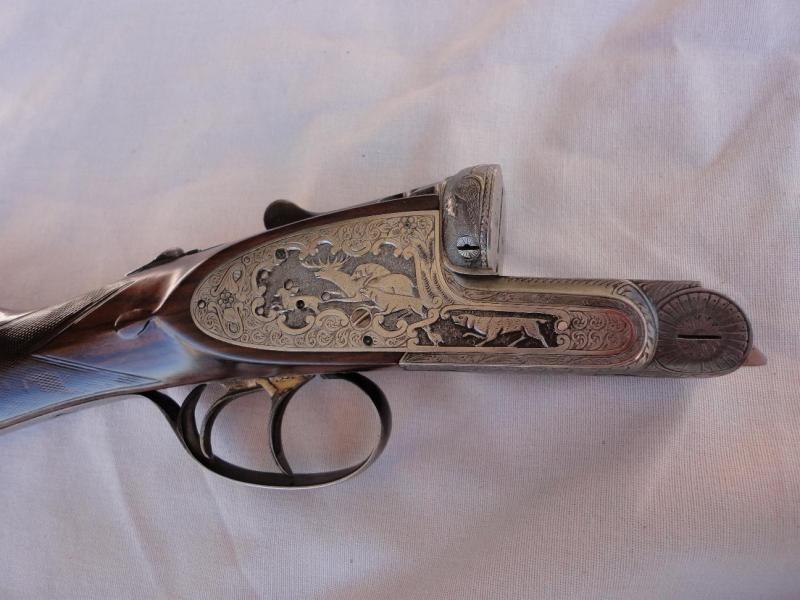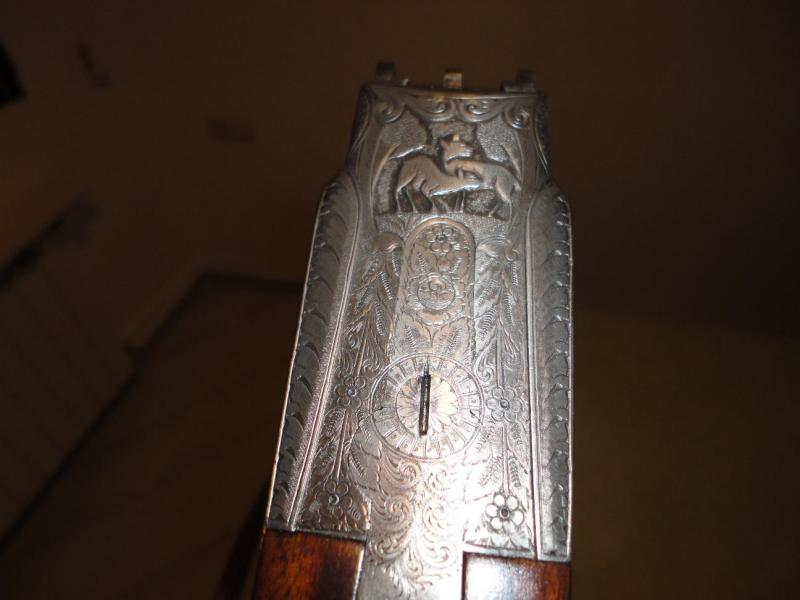 Vale el nogal español que se ve bien conservado, las llaves de doble seguro (así parece al menos por los pilares de las pletinas), los expulsores, los cañones demiblock, las válvulas aliviagases, el doble gatillo articulado... Todo apunta maneras hasta que llegamos a la báscula, que aunque sólida parece mejorable y a los grabados. Aunque el trabajo en bajorrelieve siempre tiene su gracia y su valor, la ejecución artística de los mismos es penosa y una verdadera lástima porque en mi opinión ha echado a perder un buen conjunto.
