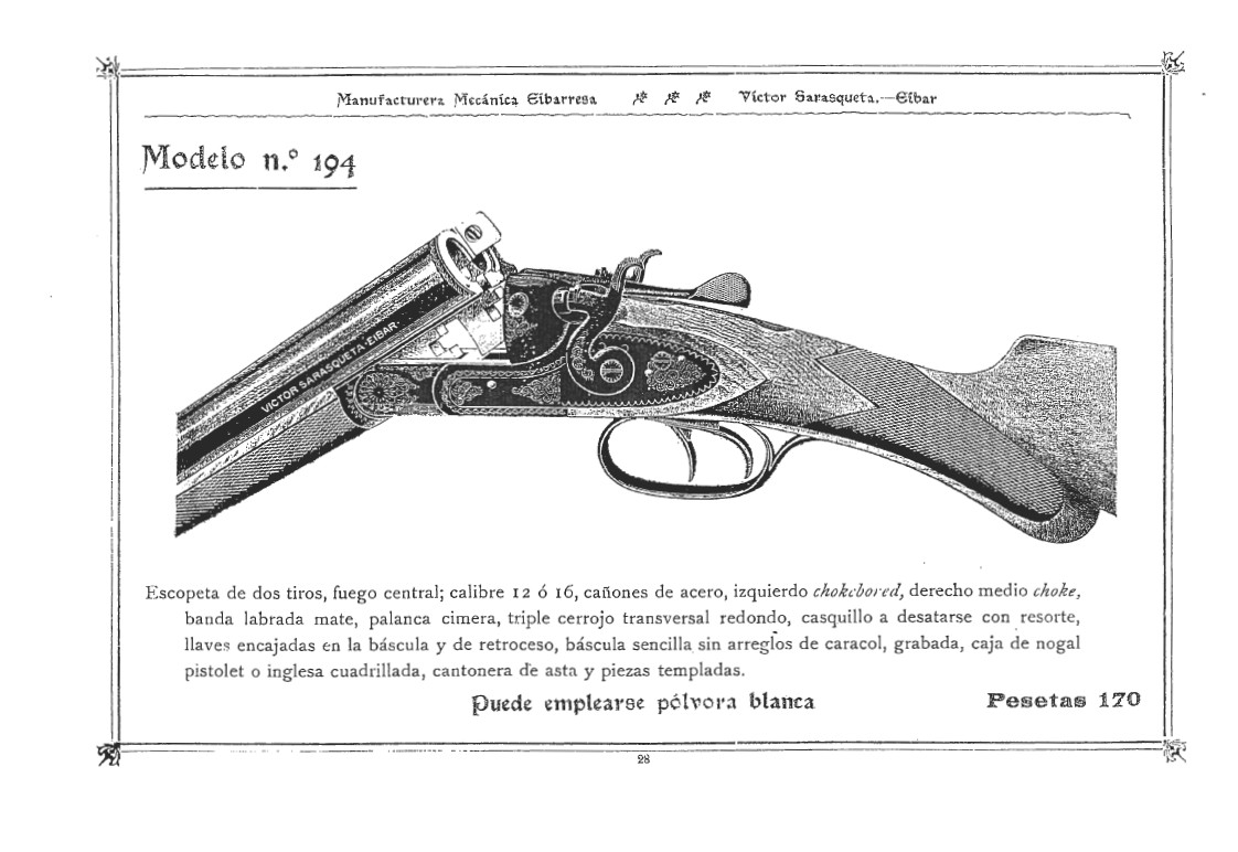 Tanto en la báscula como en los cañones, aparecen dos numeraciones distintas (2750 y 2181) que son posteriores al año 1910. Tengo un amigo que tiene una V.S. mod. 206 del año 1910 con nº de serie 1645 lo que significa que la tuya es más reciente. Por tanto, puede ser correcta la identificación como modelo 194 segun consta en el catálogo de 1908. Lo que no encuentro en los catálogos consultados la opción de elegir cañones damasquinados como los de tu escopeta. Algunas escopetas cambian el nº de modelo de unos catálogos a otros, pero en ninguno de los que yo tengo aparece la tuya con diferente denominación a la ya indicada de Mº 194. Continuaré indagando a ver que saco en claro.