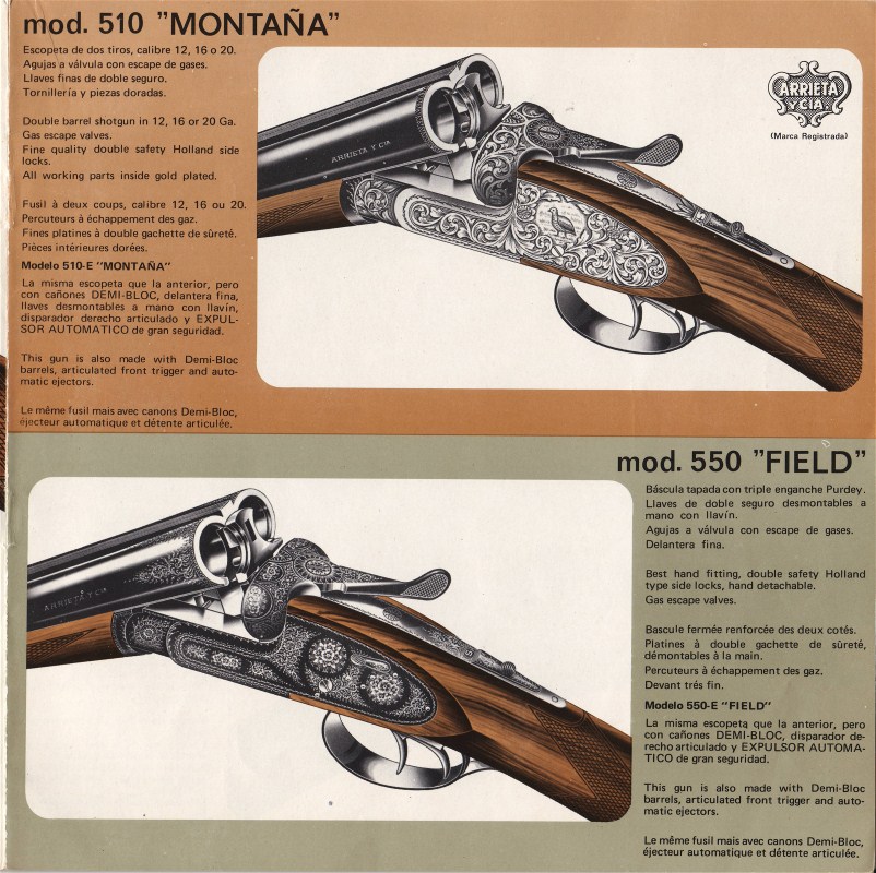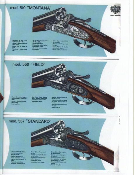 Es el único modelo de Arrieta que guarda parecido con la tuya en el grabado, aunque las especificaciones ténicas (doble cierre en lugar de triple y cañones demibloc) corresponderían a la 557. En lo referente al grabado, se debe de tener en cuenta que en los catálogos las imágenes son dibujos y no fotografías. Incluso los dibujos que aparecen en muchos catálogos de diferentes fabricantes, son copia unos de otros. Los originales de muchos de esos dibujos están actualmente en poder de Ignacio Zubillaga y los he visto personalmente.