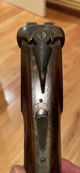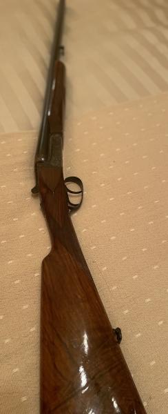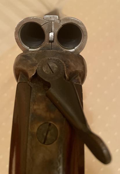 O sea de 4 y 3 decimas. Gatillo doble y expulsores. Pasamanos cola de Castor horriblemente barnizado al igual que la culata tipo inglesa, y eso que las