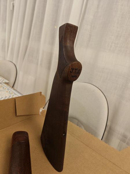 Buen trabajo, pero el guardamanos ha quedado mucho más claro, ¿no?, intenta darle más nogalina para igualar el tono con la culata.