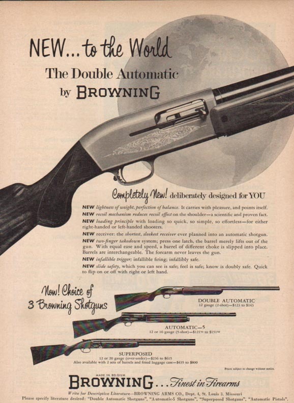 En 1955 la compañía ofrece al mercado la Browning doble, es la segunda semiautomática de la compañía, esta escopeta es como poco, transgresora, sus planteamientos tanto a nivel conceptual como en lo referente a mecánica, materiales y acabados aun hoy en día sorprenden.