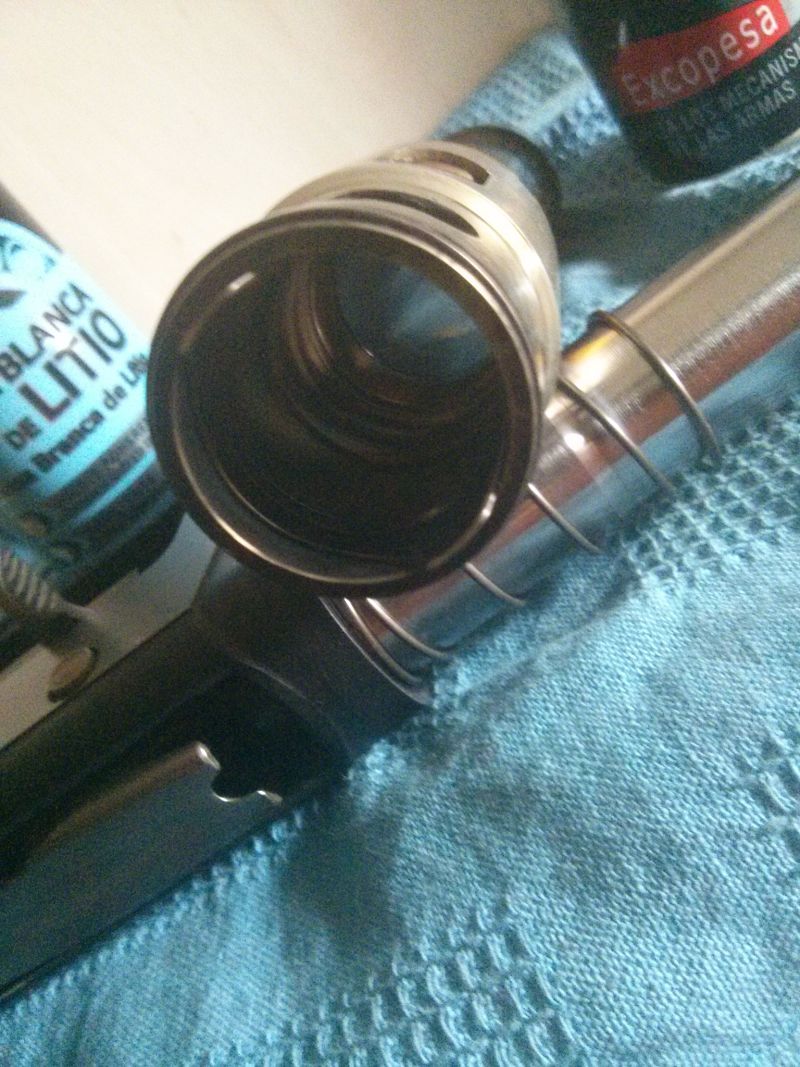 En cuanto al colector de gases que es el que viene soldado al cañón, lo mismo, limpieza con trapo húmedo y con pequeño alambre asegurar las dos perforaciones que comunican con el cañón, estas dos perforaciones son por donde penetran los gases al colector y lo presurizan accionando el pistón que empuja en tu caso el tubo de transmisión, en otros casos es una o dos bielas, depende del fabricante y el modelo.