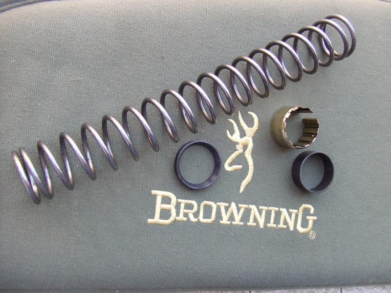La longitud del muelle de 22 cm es inadecuada ya que la longitud optima es de 24 cm, por lo tanto el muelle recuperador de tu Auto-5 esta hundido a causa de los años de compresión, lo suyo seria sustituirlo, al igual que el muelle del anillo de frenado, el que presiona y esta ubicado por encima del anillo de frenado de bronce, de hecho cambiar el anillo de bronce no estaría demás, claro, esto depende de su estado de desgaste, y sin verlo me es difícil decirlo.