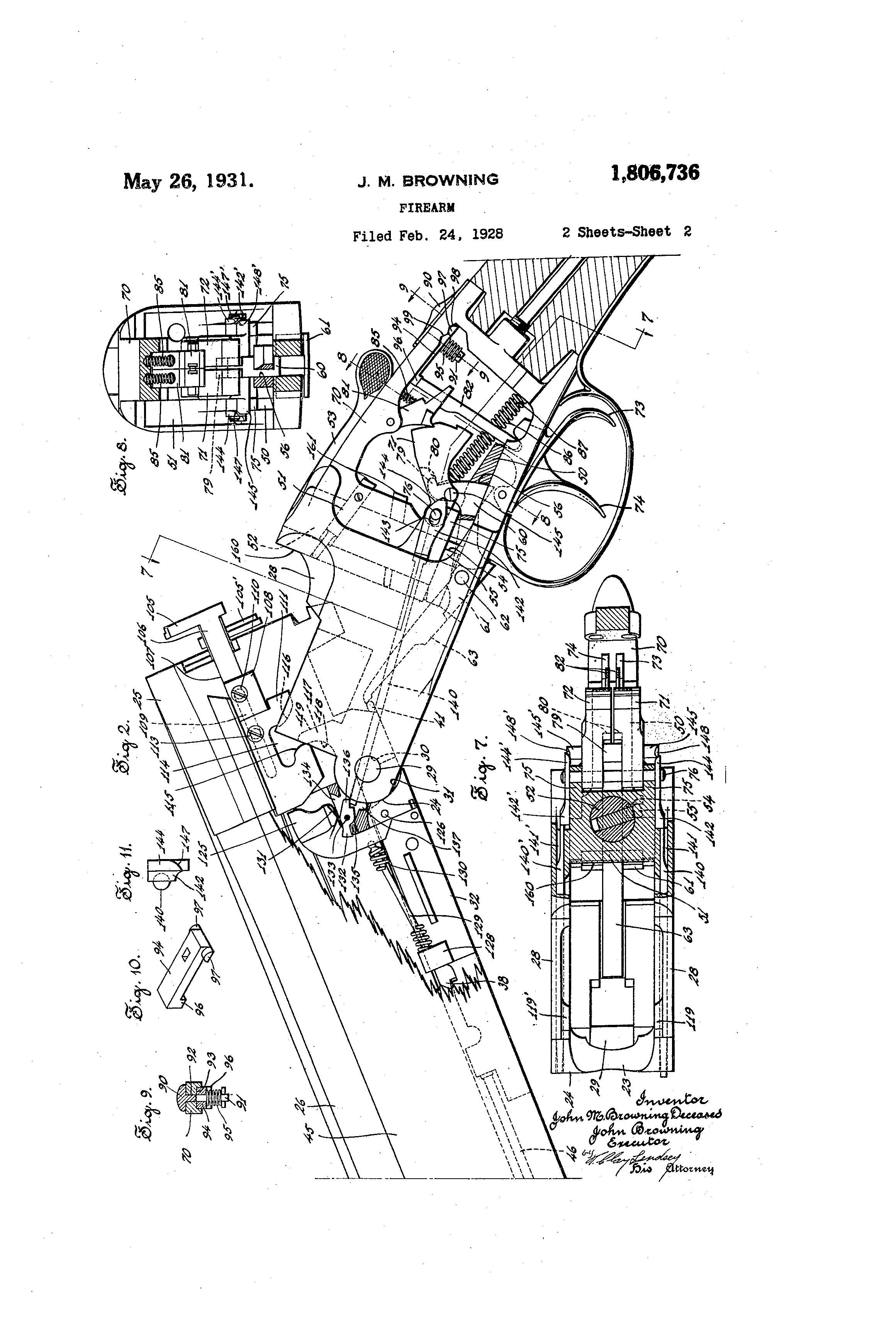 Date cuenta que fue presentada dos años después de su muerte y adjudicada 5 años después a John Moses Browning, pongo dos imágenes de dicha patente donde pone claramente que el inventor es John Moses Browning y el ejecutor de dicha patente es su hijo mayor John Browning