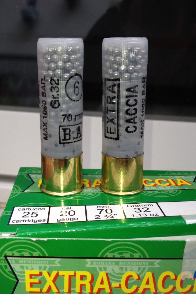 Me he hecho con una caja de la marca Romana Municione de 32 gramos del 6 y son de color blanco (no amarillos). El modelo es Extra Caccia. El taco solo coge la mitad de los perdigones y éstos son muy brillantes.