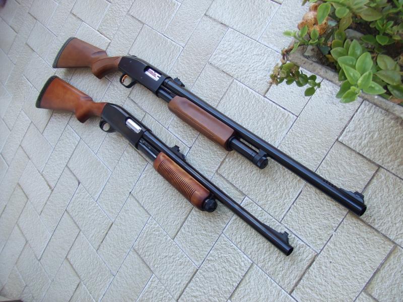 Arriba, una Mossberg 500 con cañón rallado de 24", abajo una Remington 70 Wingmaster con cañón de 20" con cañón cilíndrico modificado.