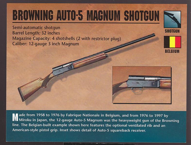 Hola amantes de la Auto 5. Aunque tenía una Auto 5 de 1929 en muy buen estado, no pude resistirme a hacerme con una segunda que se puso a la venta en este foro allá por abril. Ésta es de 1959 y aunque aún es toda de acero y sin banda en el cañón, ya presenta variaciones, como que el seguro va en la parte posterior del guardamontes en lugar de ir delante, lleva sistema de carga speed loading o que en la báscula ya no pone la leyenda "Fabrique Nationale D'Armes de Guerre-Herstal Belgique" sino solamente BROWNING.