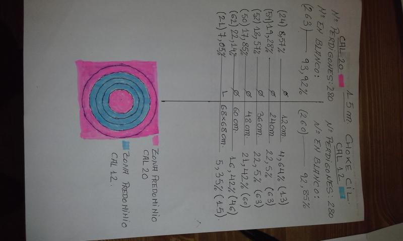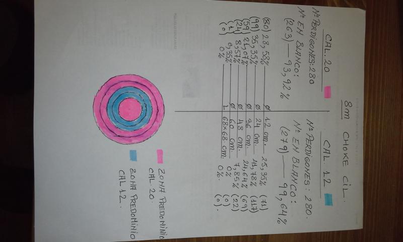 me queda pendiente otra prueba, que me parece importante, es la de penetracion. Intentare hacerla sobre listines telefonicos. lamentablemente en varias de las dianas ha habido algunos perdigones que han marcado pero no traspasado. Con los dos calibres muy parecido. Lo preocupante es que ha sido incluso en la distancia de 8m. Oscilan entre un 1% a 2%,. con esa prueba podria descartarse si esto se debe a los chokes o a la calidad de los cartuchos o aun peor a la de la polvora. Hablando con un compañero de foro que conoce bien el tema, parece que las polvoras que usamos en España distan mucho de ser lo que nos venden. su mejor cualidad es que son baratas.