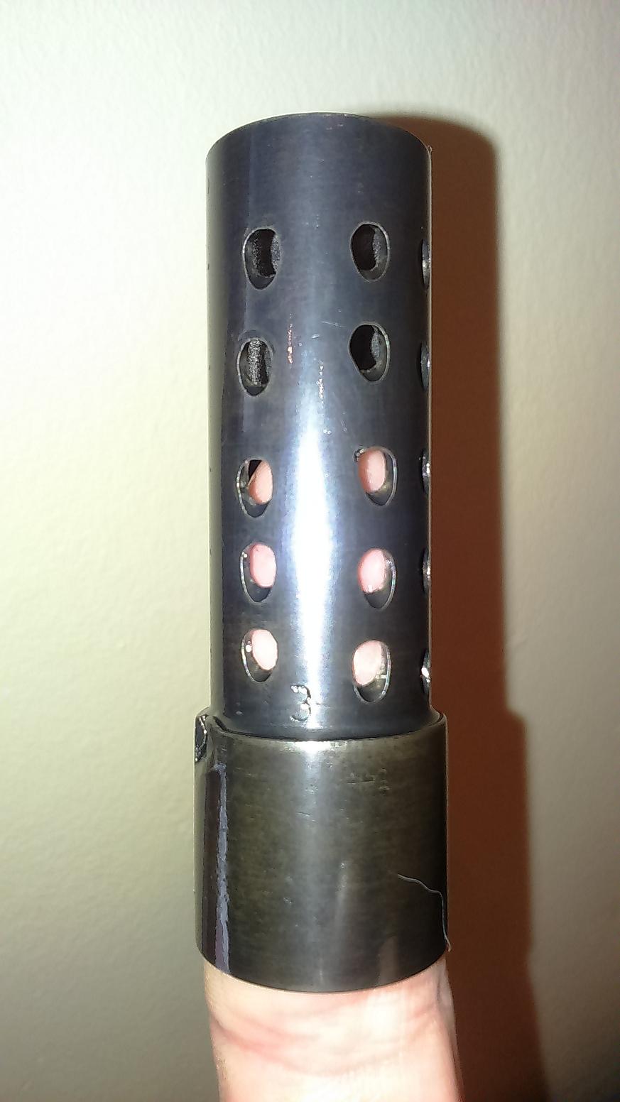 Acabo de adquirir una semiautomática del 12 con choques exteriores y entre estos hay uno cortito de 7cms al que su anterior dueño (ahora fallecido) hizo o mandó hacer unos agujeros más bien a modo de apagallamas, ya que al estar localizados en toda su circunferencia supongo que no amortiguará nada el retroceso.