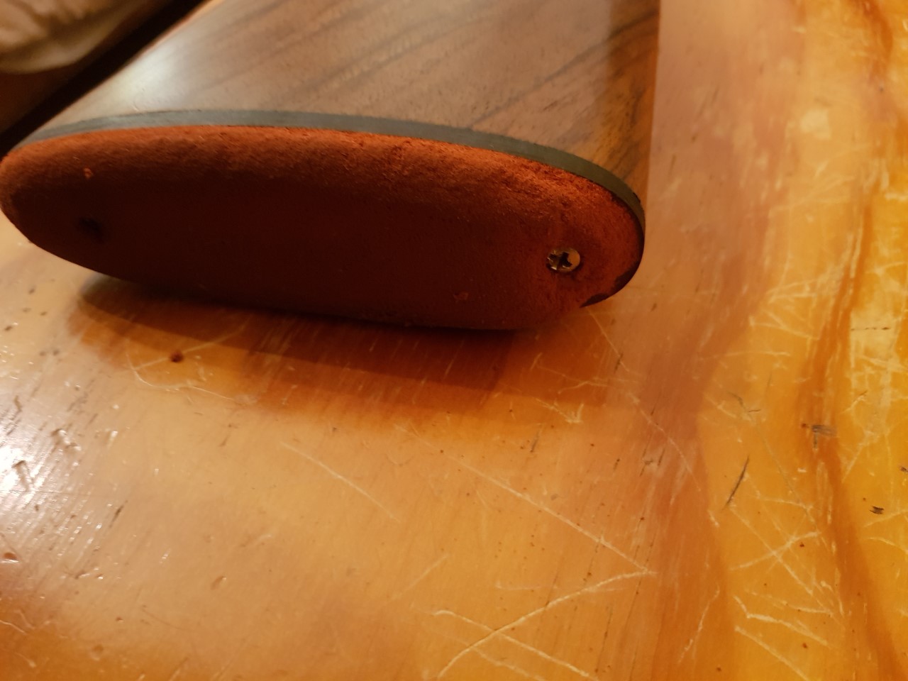 Aquí se ve como la cantonera está deteriorada sobretodo en la parte superior donde muestra hasta el tornillo. La guardo en armero homologado sobre una base de espuma y tiene mucho sentido eso que decís del aceite y el peso sobre una cantonera de por sí delicada. La escopeta la compré de segunda mano pero le pusieron la cantonera nueva el día de la compra. Lo que sí veo es que son muy bonitas para una escopeta fina como esta, una grulla 215, pero requieren de algo de atención.